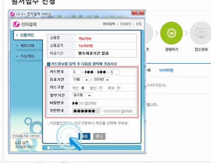 결제하기를 통해 신용카드로 할지,계좌이체로할지,가상계좌로 할지 결정후 응시수수료를 결제 합니다