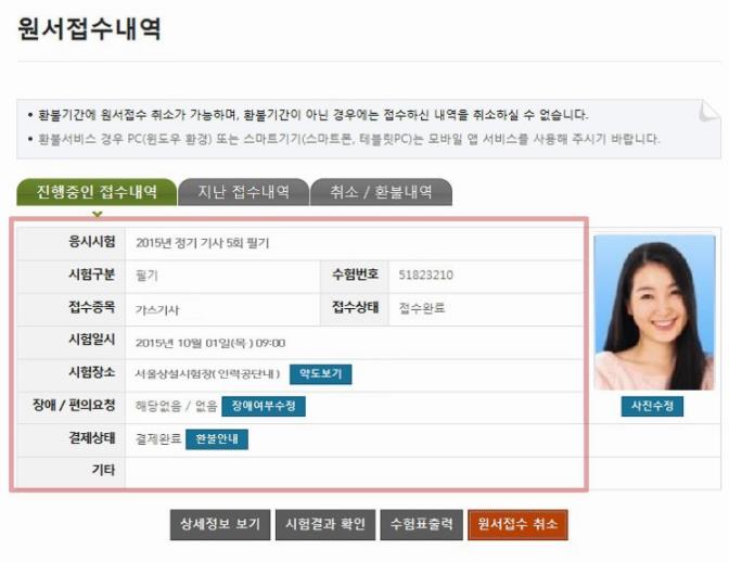 결제가 완료되면 원서 접수내역에서 내가 원서를 제대로 접수했는지 확인이 가능해집니다.