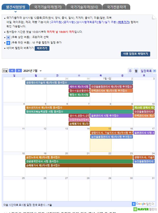 큐넷 홈페이지에서는 시험일정을 위처럼 월간 캘린더별로도 확인이 가능합니다. 또 국가기술자격증 시험을 정기와 상시일정도 확인이 가능합니다.