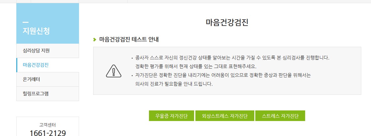 마음건강검진 의 경우 종사자의 전신건강상태를 스스로 진단 할 수 있는 페이지입니다.