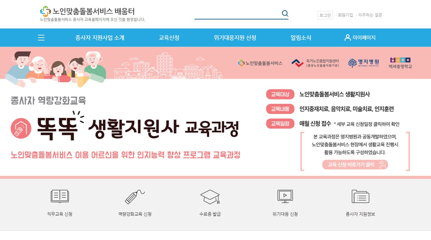 돌봄서비스에 종사하는 생활지원사, 사회복지사 등 에게 교육지원 사업과 심리 정시 지원사업을 운영하는 홈페이지 이며