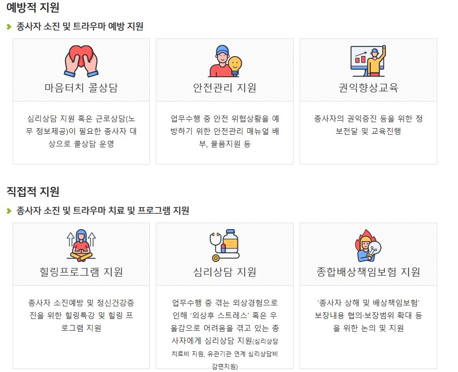 이 외에도 관련 종사자 들의 예방적 지원,직접적 지원을 제공하고 신청할 수 있습니다.