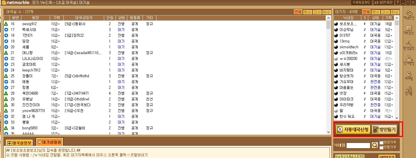 이렇게 대국실들잉 보이는데요. 게임이 진행중인방도 있고 공개하는 방도 있습니다.