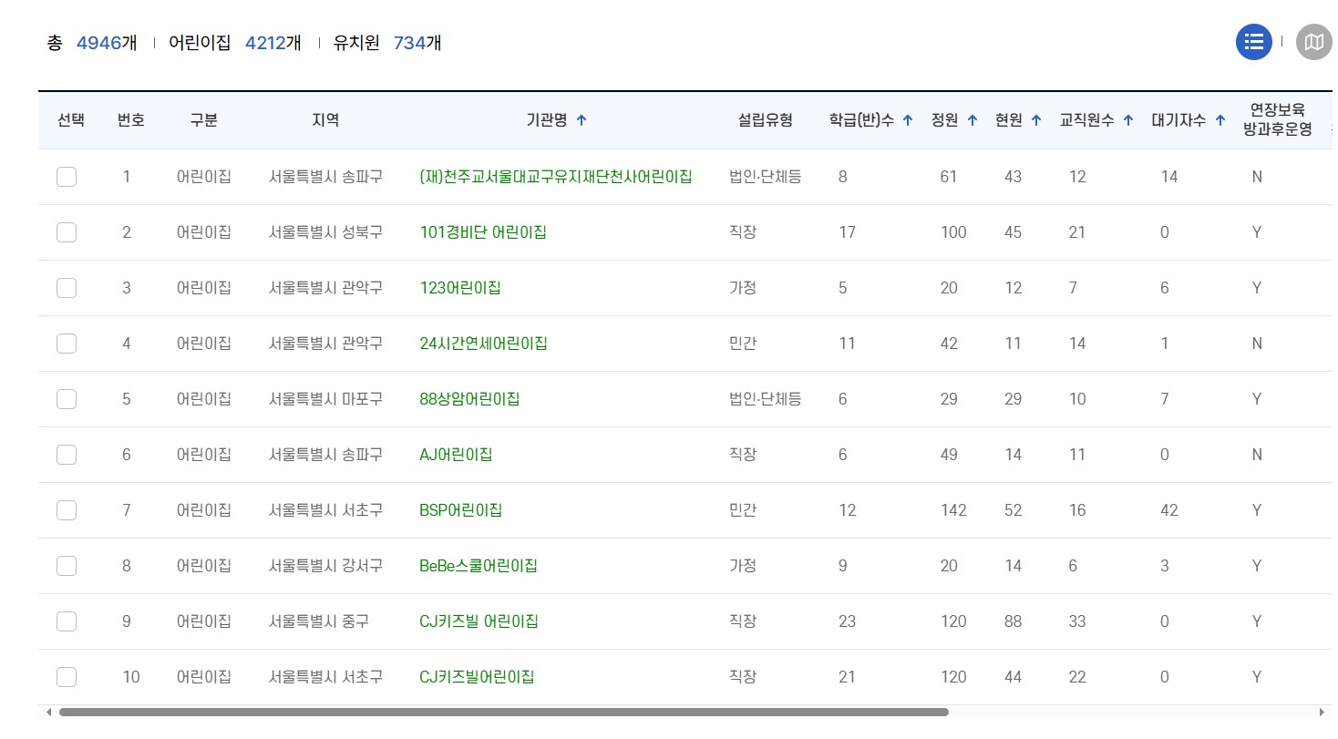 각 유치원 어린이집 별 자세한 정보를 확인하고 싶다면 기관명을 클릭합니다.