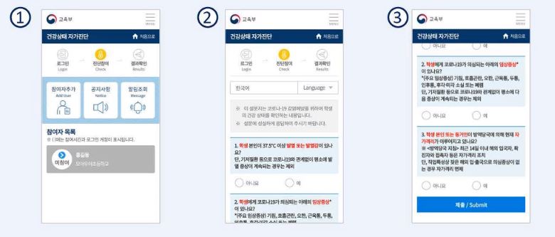 건강상태 자가진단 홈페이지는 교육부에서 등교전 초,중,고교생,유치원생,교직원들의 건강상태를 체크하기 위해 구축한 홈페이지 입니다.