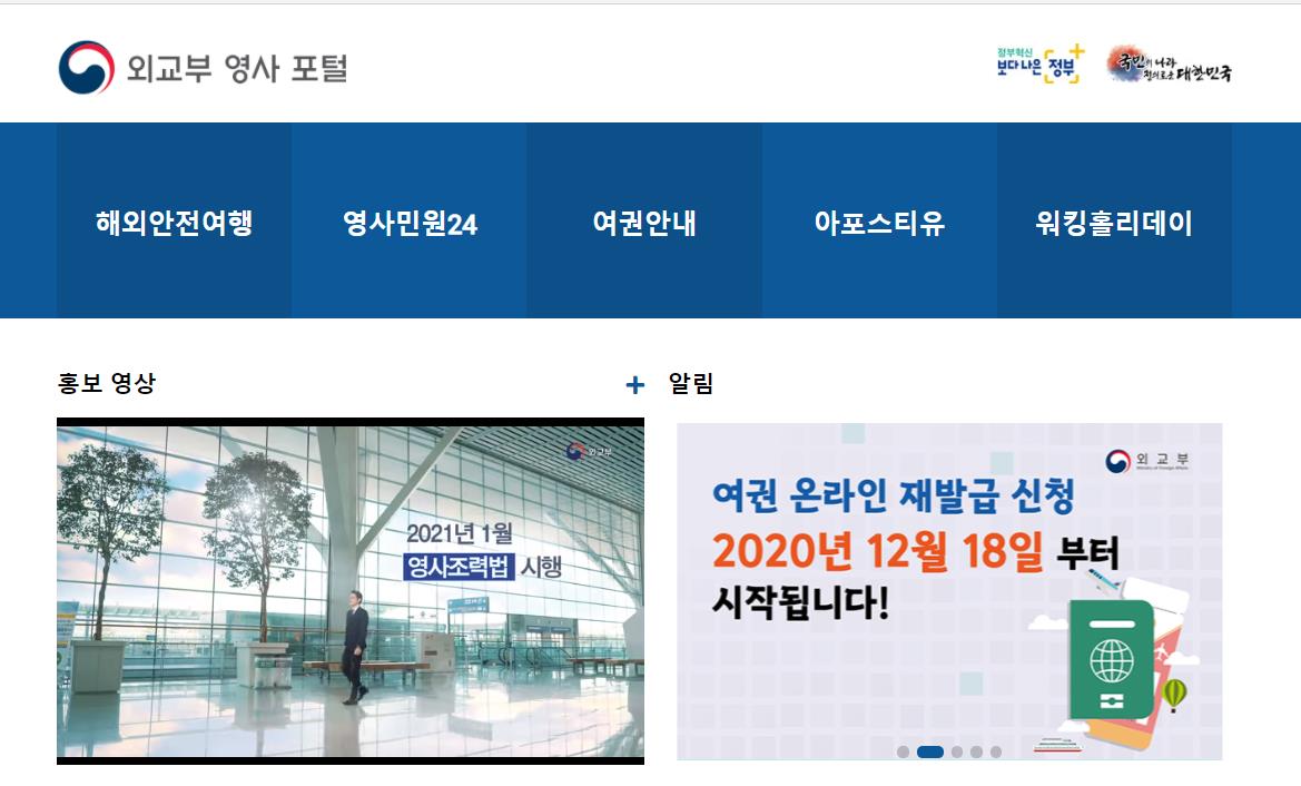 해외안전여행,영사민원 24,여권안내,아포스티유,워킹홀리데이 큰틀로 이동할수 있으며 홍보영상과 주요 외교관련 알림을 통해 정보를 확인 할수 있습니다.