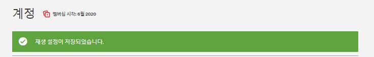 저장을 클릭하면 계정 페이지로 넘어가며 위 사진처럼 '재생설정이 저장되었습니다'라는 초록색 바가 나와야 설정이 완료됩니다.