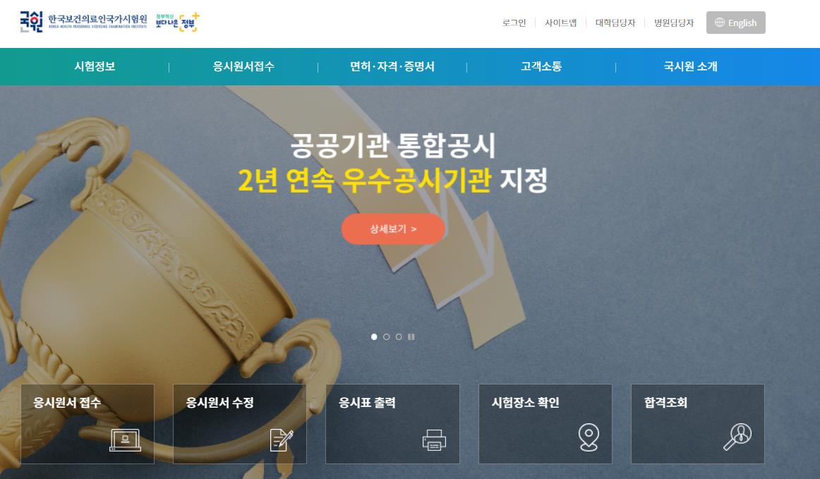 국시원 홈페이지에서는 관련된 시험의 응시원서 접수와 응시표출력,시험장소확인,면허,자격증명서 발급,합격조회 등 한국보건의료국가시험과 관련된 업무를 확인 할수 있습니다.