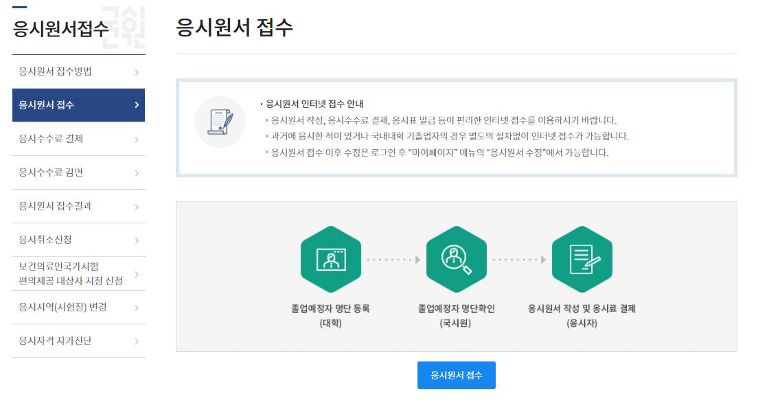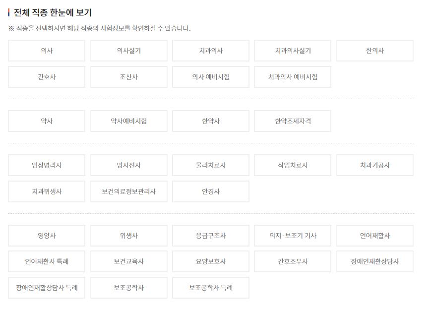 의사,치과의사,한의사,간호사,조산사,약사,한약사,임상병리사,방사선사,물리치료사,작업치료사,치과기공사,치과위생사,보건의료정보관리사,안경사,영양사,위생사,응급구조사,의지보조기 기사,언어 재활사,보건교육사,요양보호사,간호조무사,장애인재활상담사,보조공학사와 관련된 시험을 치려면 국시원홈페이지에서 응시 및 접수해야합니다.