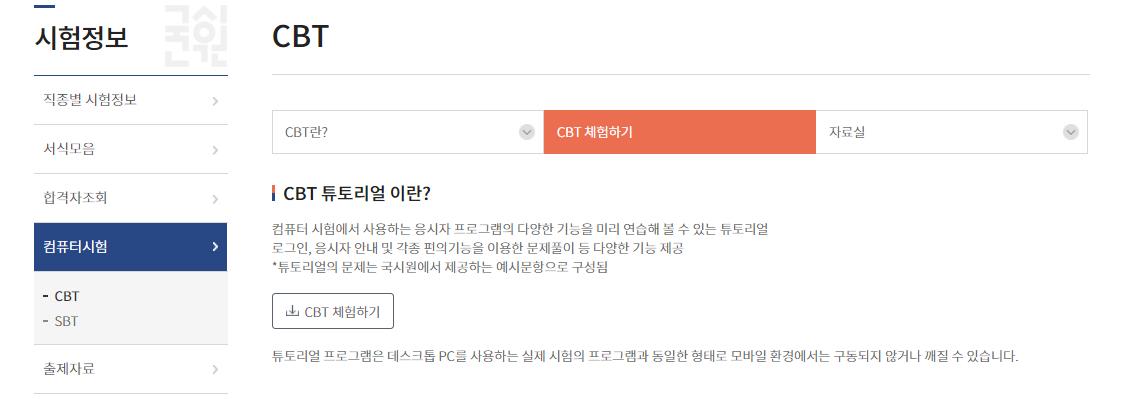 CBT형태로 시험이 출제되는 시험들도 있어서 시험을 풀어보기 전에 CBT문제를 연습삼아 풀어볼수 있습니다.