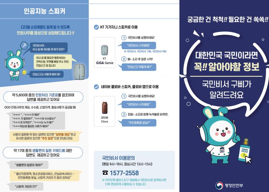 국민비서는 챗봇서비스와 인공지능 스피커 서비스를 제공하여 행정서비스와 관련되어 자주 질문하는 내용에 대해 미리 구축한 질의응답을 기반으로 24시간 상담을 가능하도록 하는 홈페이지입니다. 최근 백신접종예약 알림과 장학금 신청등 관련된 정부 서비스 일정을 미리 알림하여 일정을 놓치지 않도록 비서 같은 기능도 하기도 합니다.