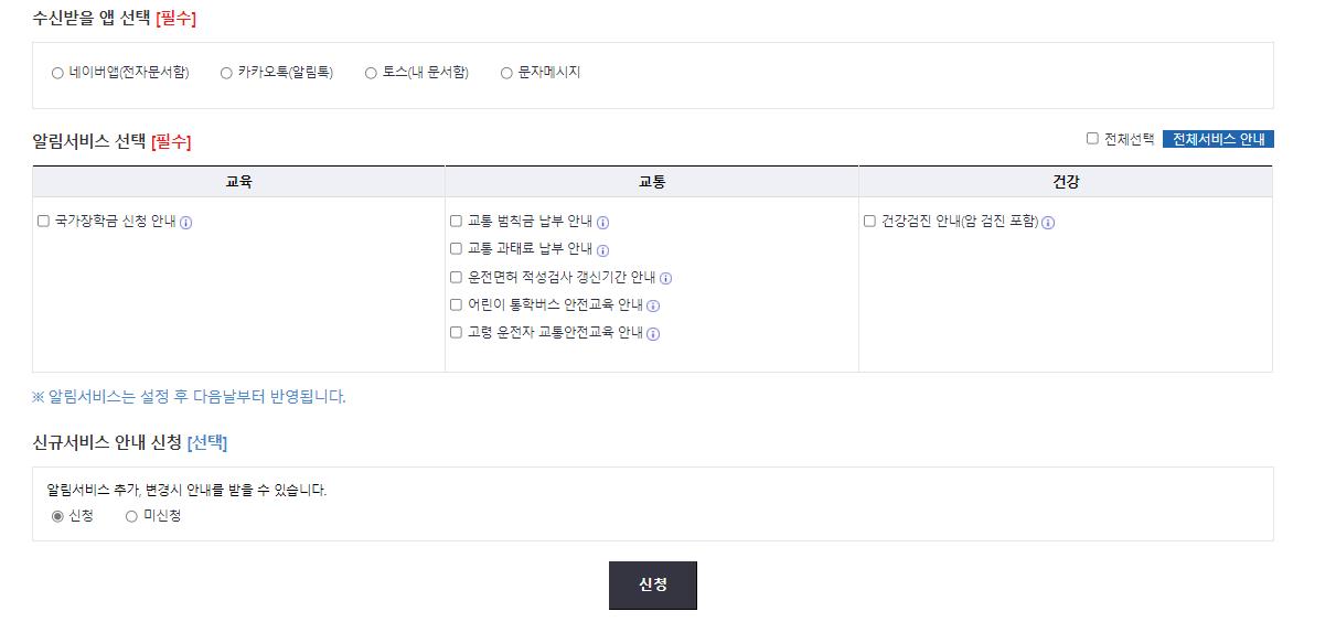 국민 알림서비스는 현재 국가장학금신청안내와 교통범칙금,과태료,운전면허 적성검사 갱신기간안내,어린이 통학버스안전교육안내,고령운전자 교통안전교육안내,건강검진 안내일 등을 알림서비스 하고 있습니다.