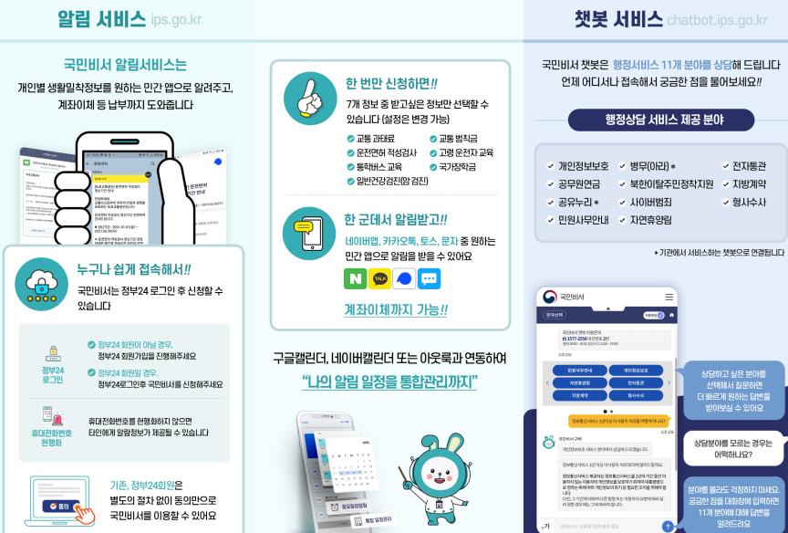 알림서비스는 교통범칙금,교통과태료,운전면허갱신,국가장학금 신청안내 등을 서비스 하고 있으며 상담서비스는 행정서비스 문의사항을 간편하게 국민비서 챗봇에게 안내받을수 있습니다.