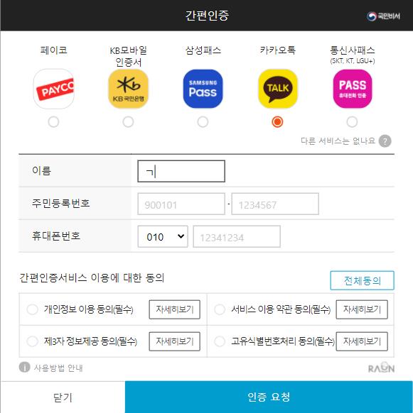 전화번호와 주민등록번호를 입력후 인증요청하면 카카오톡 카카오지갑에서 인증요청 메시지가 옵니다.