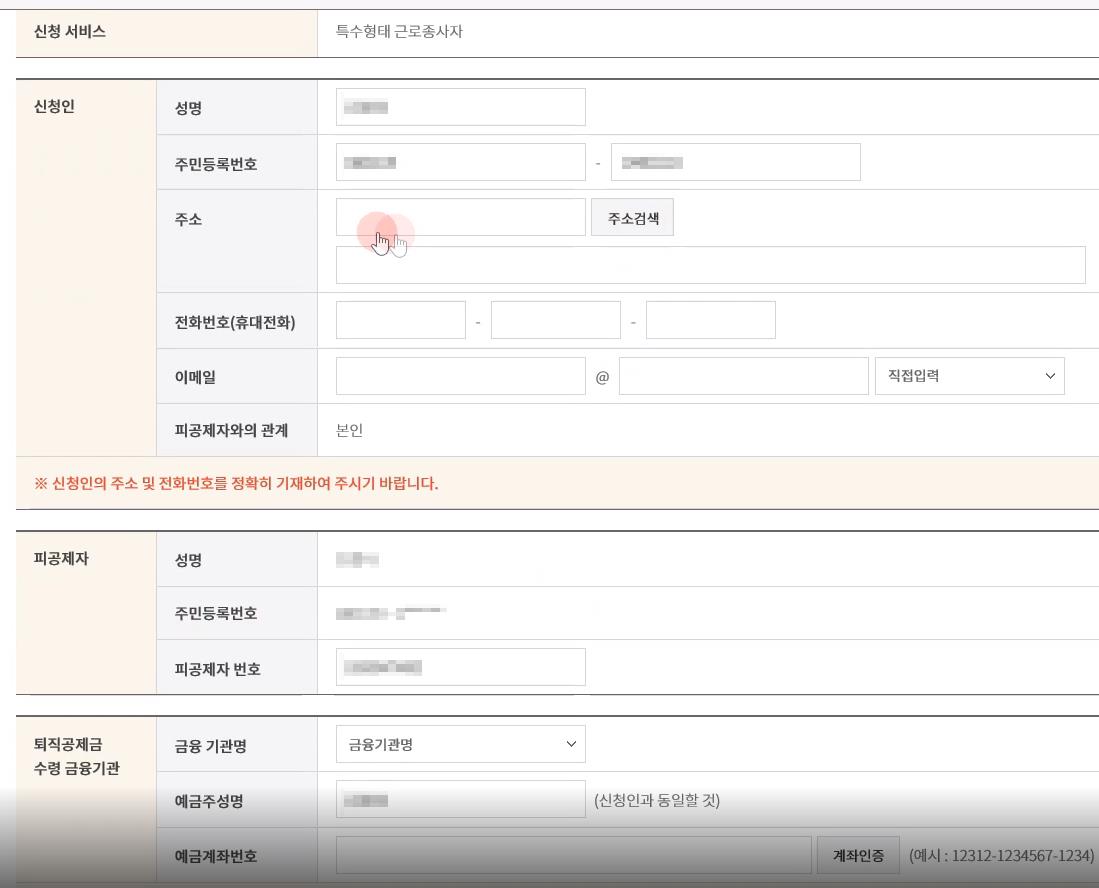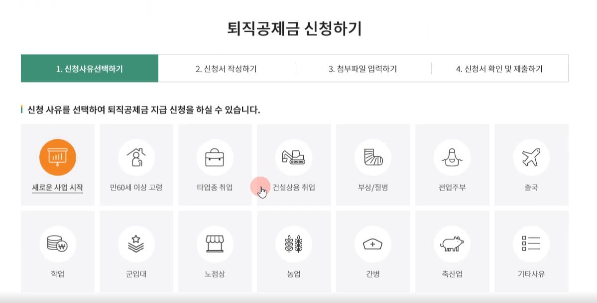 퇴직하는 해당되는 사유를 클릭한후 신청내용에 인적사항과 퇴직공제금 신청에 필요한 내용을 작성합니다.