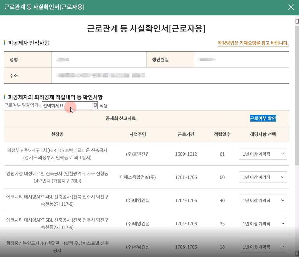 적립일수는 사업주에서 나의 인적사항에 근로관계 사실확인서를 작성하여 제출하는데요.
