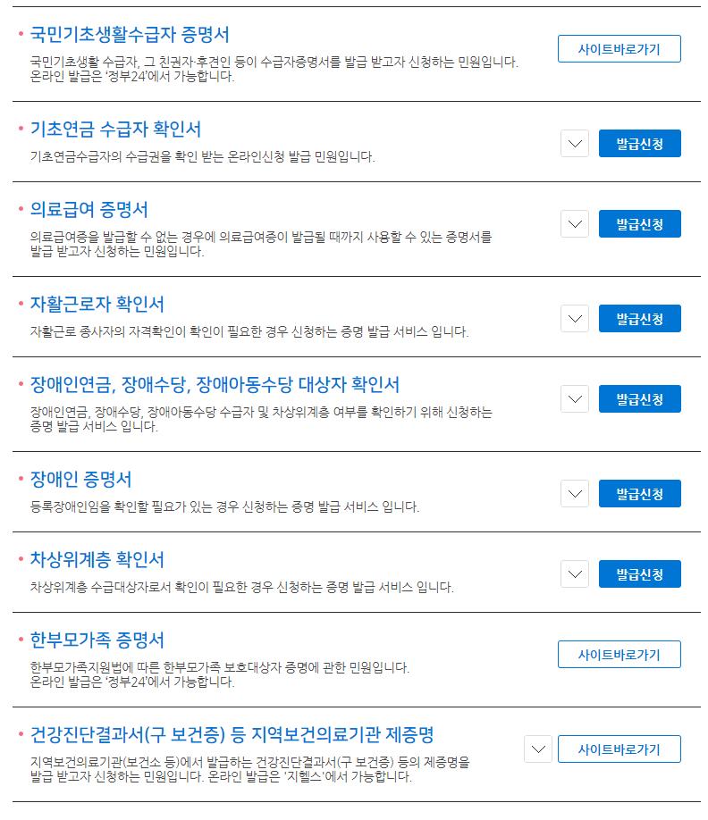 복지로 온라인 홈페이지에서 국민기초생활수급자증명서,기초연금수급자확인서,의료급여증명서,자활근로자확인서,장애인연금,장애수당,장애인증명서,차상위계층확인서,한부고가족증명서 등을 발급할수 있습니다.