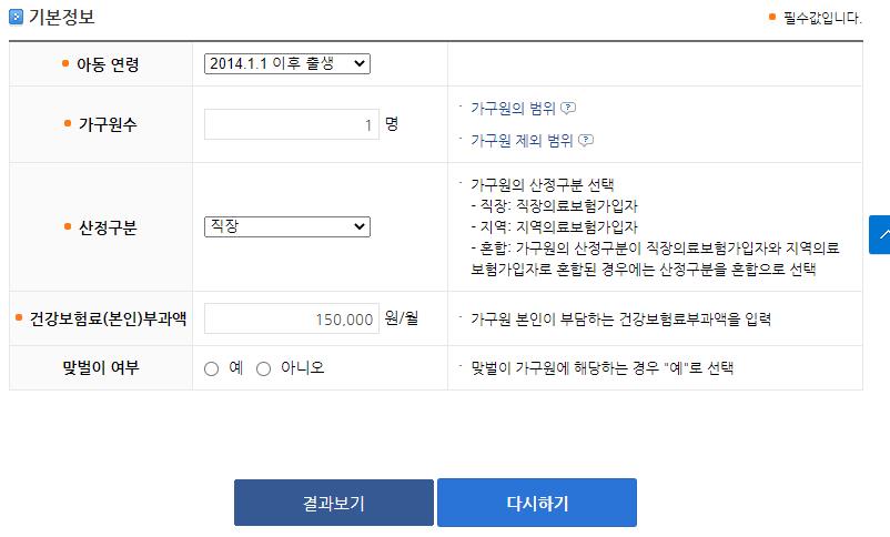 아이돌봄서비스에 나의 기본정보로 가구원수,건강보험료등을 입력해 확인해보았습니다.