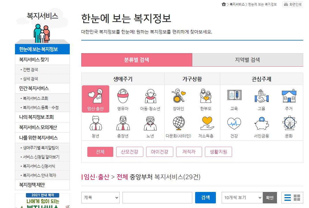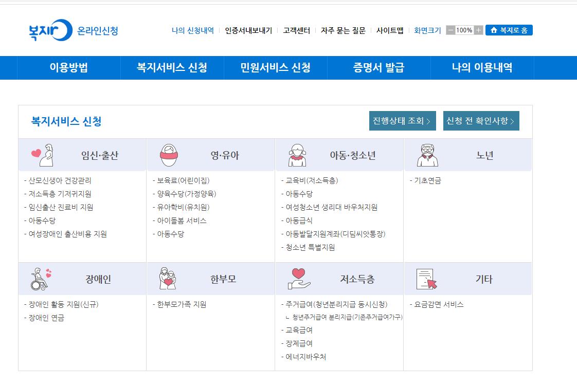 주로 산모신생아 건강관리, 저소득층 기저기지원,임신출산진료비지원,아동수당,여성장애인출산비용지원과 보육료,양육수당,아이돌봄서비스,아동수당,교육비,아동급식,장애인연금,한부모가족지원,주거급여,교육급여,에너지바우처,요금감면서비스등을 신청할수 있습니다.
