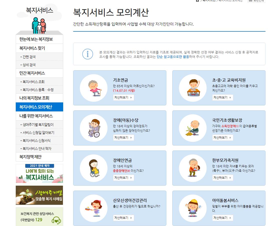 내가 받을수 있는 복지서비스 모의계산 해볼수 있습니다.