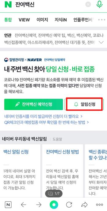 네이버 잔여백신 예약 알람을 끄기위해 네이버 어플에서 '잔여백신'을 검색했습니다.