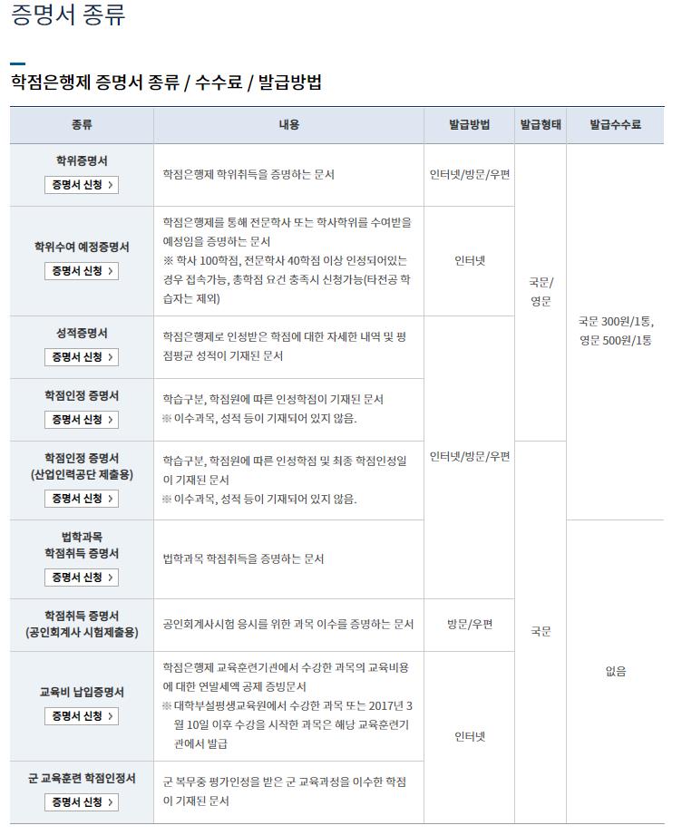 학위증명서와 학위수여예정증명서,성적증명서,학점인정 증명서,법학과목학점취득증명서,학점취득증명서,교육비납입증명서,군교육훈련 학점인정서를 학점은행 홈페이지에서 신청이 가능합니다.