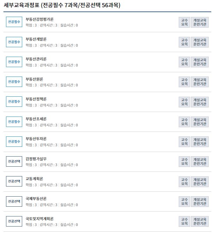 원하는 교육과정을 선택하면 전공필수과목과 전공선택 과목 확인이 가능합니다.