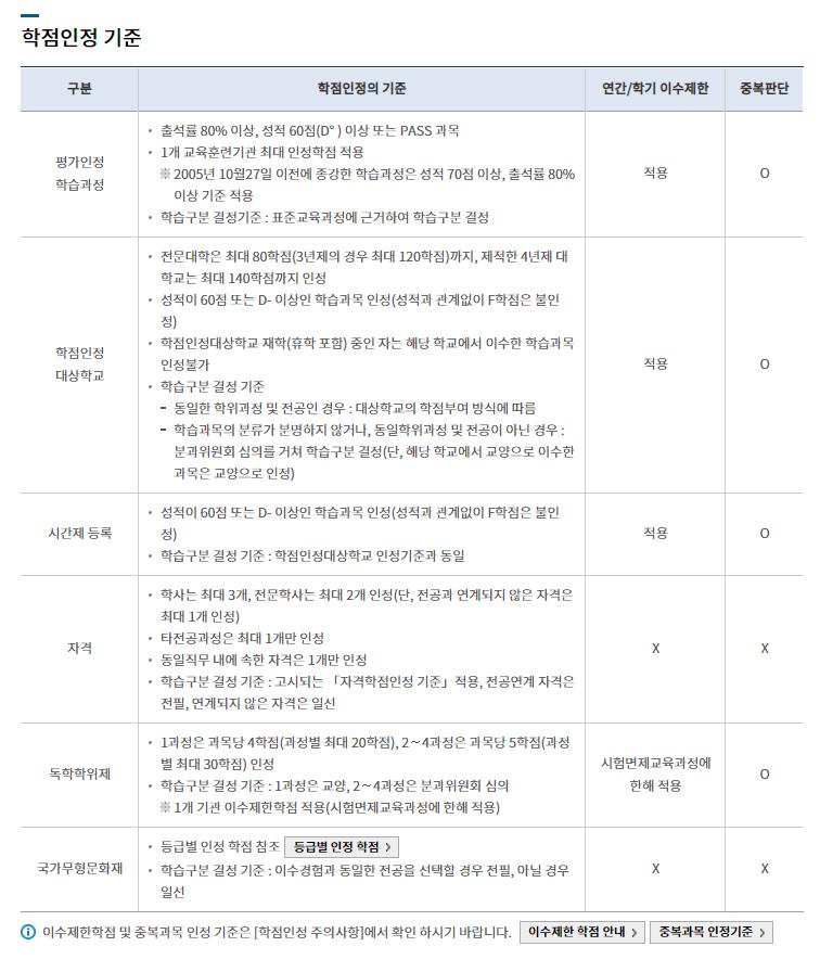 평가인정학습과정,학점인정대상학교,시간제등록,독학학위제등 유형에 따라 학점인정 기준이 달라집니다.