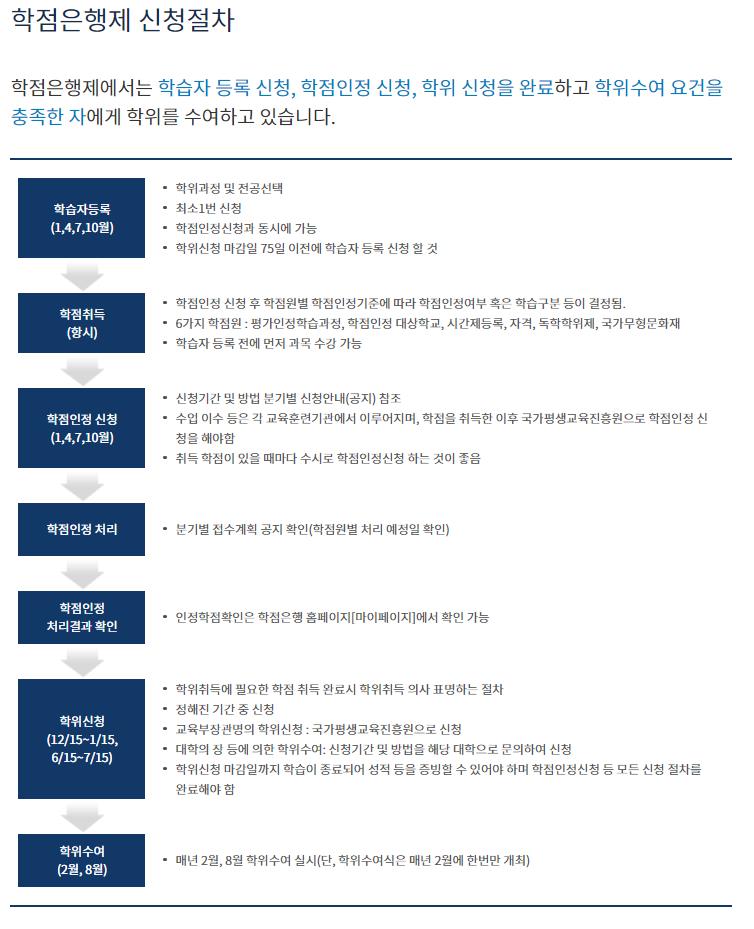 학점은행제는 국가평생교육진흥원에서 진행하며 학점인증등에 관한법률에 의거해 학교뿐 아니라 학교밖에서 할수 있는 다양한 형태의 학습이나 자격 취득을 학점으로 인정받을수 있게 하여 그 학점이 누적되어 기준이 충족되면 학위취득을 가능하게 하는 제도입니다.