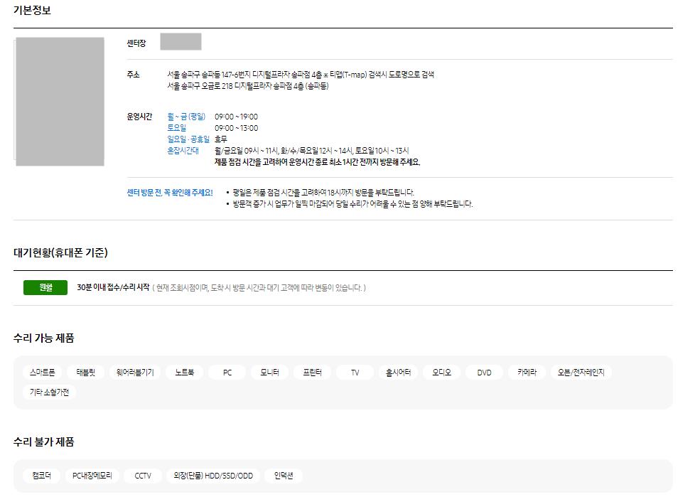 현재 대기현황과 수리가능제품,수리불가능한 제품들도 정리되어 있어 방문전 미리 확인하는게 좋습니다.
