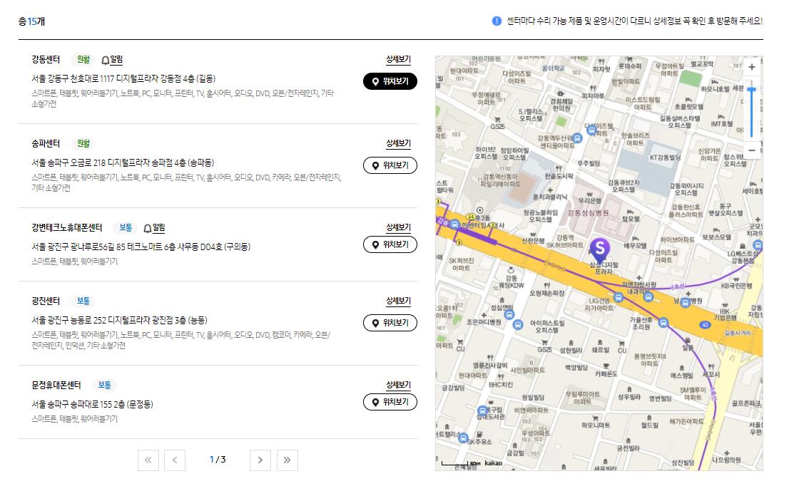 이렇게 내가 위치한 지역 주변의 삼성전자 서비스센터를 지도에서 위치를 파악해서 갈수 있습니다.