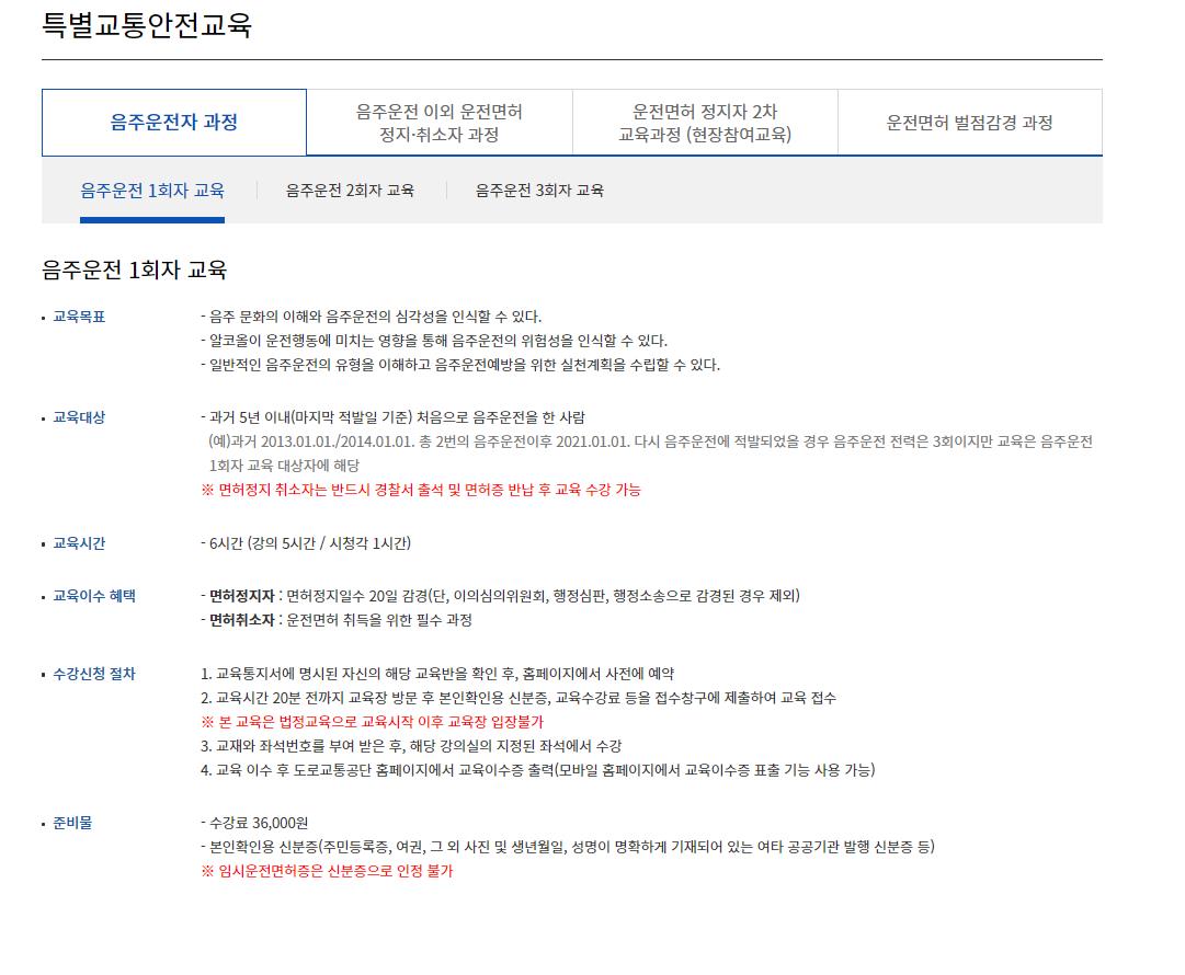 특별교통안전교육은 음주운전 관련한 처벌을 받은사람이 들어야 합니다.