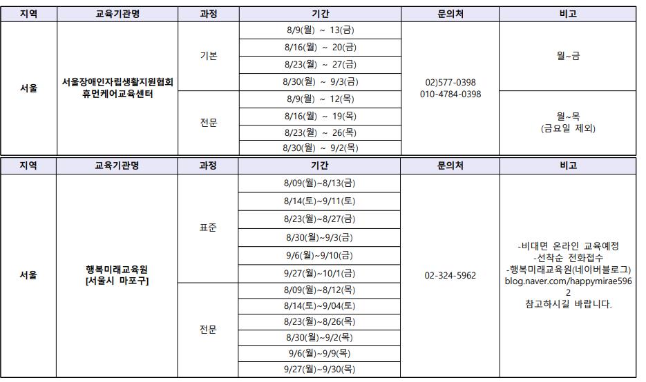 서울지역은 주로 서울장애인자립생활지원협회 휴먼케어교육센터,마포구의 행복미래교육원,한국장애인자립생활센터 총연합회 영등포구,사람희망 금천장애인자립생활센터에서 교육을 진행합니다.