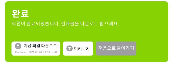 PDF합치기가 완료되면 파일을 미리보거나 다운로드 하여 저장할수 있습니다.