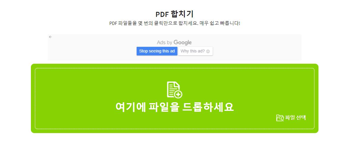 PDF합치기 배너를 클릭해 합칠 PDF파일을 드롭하거나 파일선택을 눌러 파일을 불러올수 있습니다.