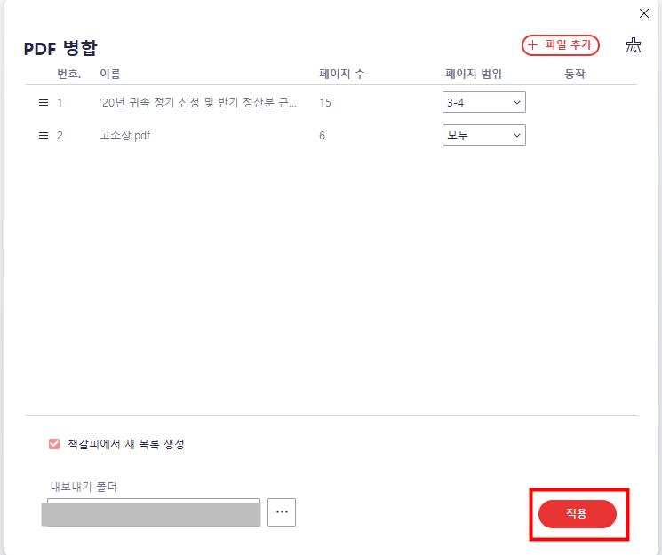 저장할 위치를 선택한후 적용을 하면 간단하게 pdf파일이 합쳐집니다.