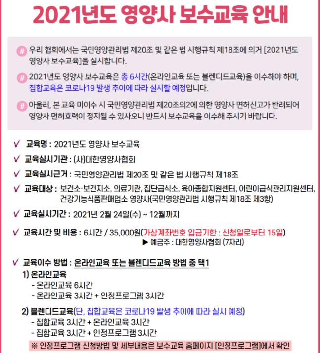 영양사 보수교육은 6시간으로 수수료는 35000원입니다.