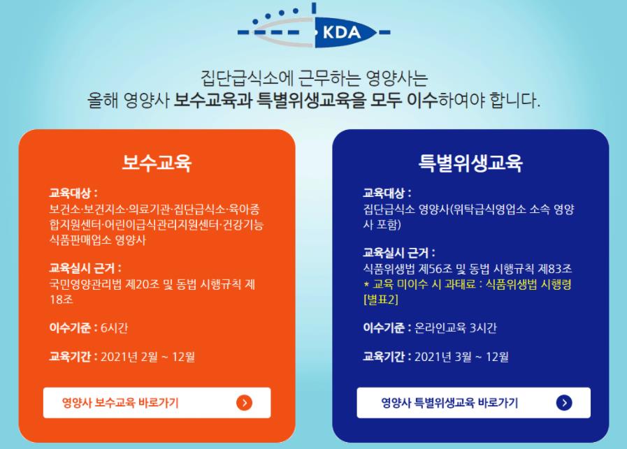 영양사 특별위생교육은 수수료가 12,000원으로 KDA온라인 위생교육센터(kdaedu1.or.kr)에서 별도로 이수 가능합니다.