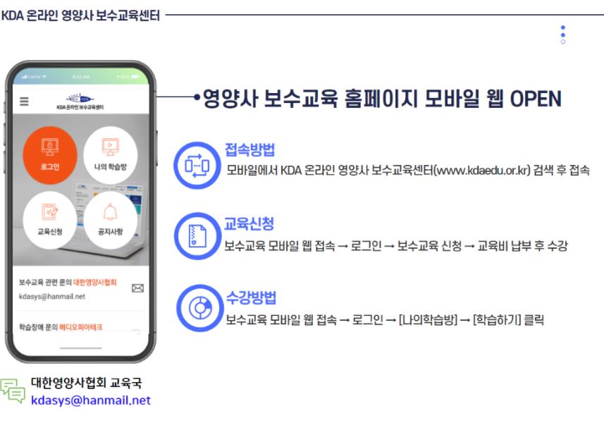 모바일에서 KDA온라인 영양사 보수교육센터 홈페이지에 접속하여 로그인하여 보수교육을 신청할수 있습니다.