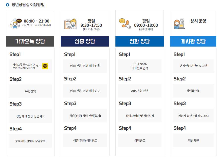 카카오톡이나 심층상담,전화상담,게시판 상담등 여러 방식으로 상담이 가능합니다.