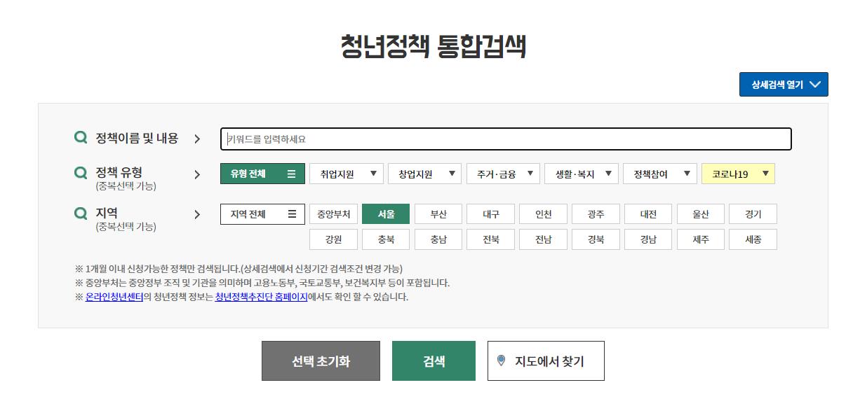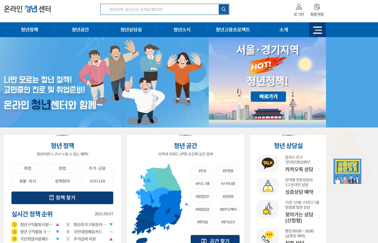 온라인청년센터 홈페이지(youthcenter.go.kr)에서는 각 전국 지역별 청년정책중 취업지원,창업지원,주거금융지원,생활,복지지원,정책참여등 다양한 청년 정책들을 볼수 있습니다.