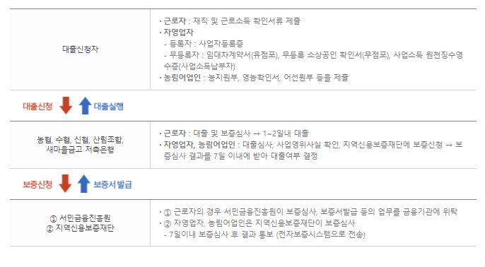 이렇게 대출을 받으면 대출기관에서 서민금융진흥원과 지역신용보증재단에 보증서 발급을 신청해 보증서가 발급 완료되면 대출 실행이 완료됩니다.