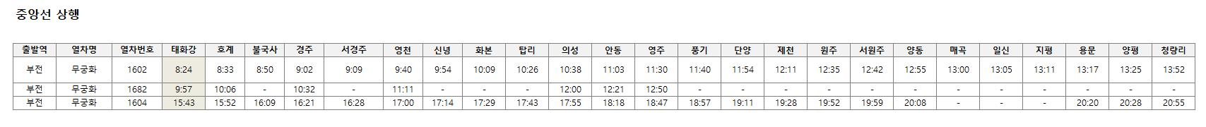 중앙선 상행시간표입니다-태화강역에서-효계역-불국사역-서경주역-영천역-신녕역-화본역-탑리역-의성역-안동역-영주역-풍기역-단양역-제천역-원주역-서원주역-양동역-매곡역-지평역-용문영-양평역-청량리역까지운행합니다.