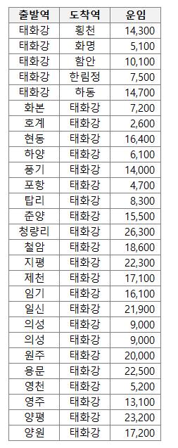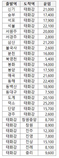 태화강을 출발하거나 도착하는 무궁화호 열차요금입니다.