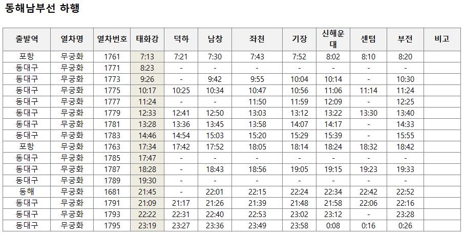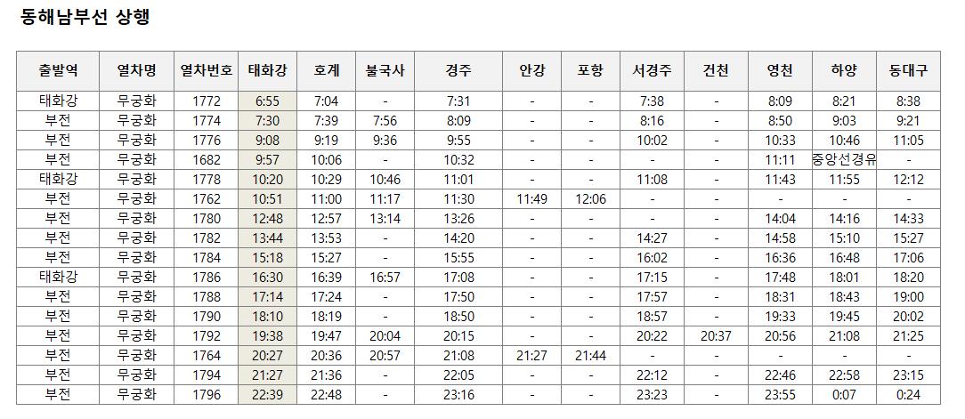 - 태화강역 열차 동해남부선 무궁화호 시간표