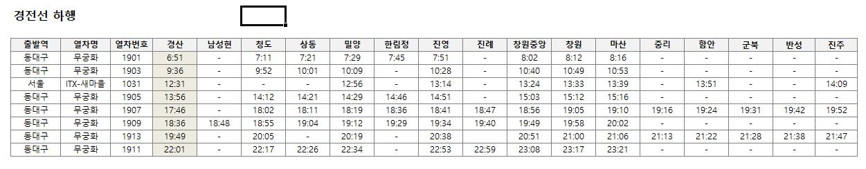 경산역을 경유해 지나가느 ㄴ경전선 하행시간표입니다.