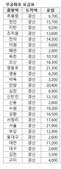 경산역을 출발하거나 도착하는 무궁화호와 새마을호 요금표입니다.