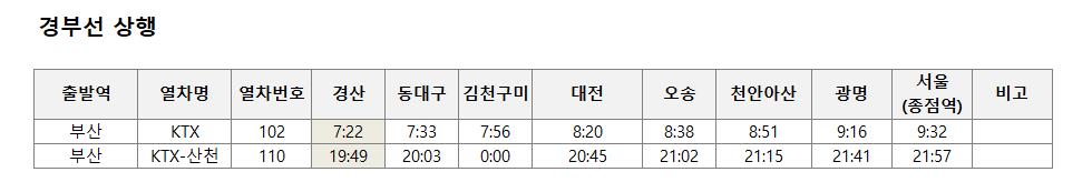 경부선 KTX 상행시간표입니다. 하루에 두번정도 운행합니다.