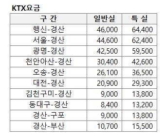 경산역을 출발하거나 도착하는 KTX열차 일반실과 특실 요금입니다.