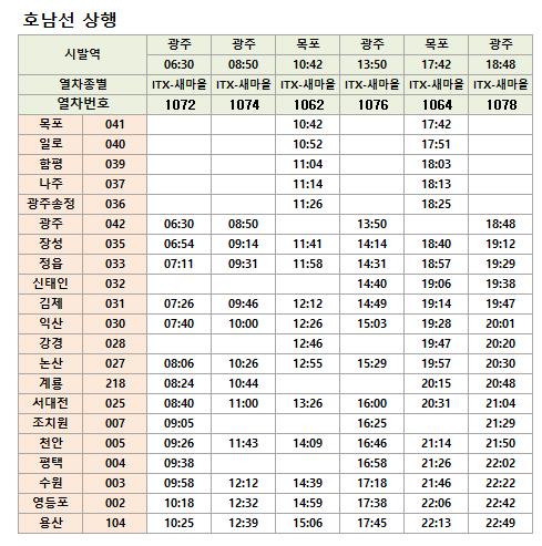 광주역이나 목포역에서 출발하는 호남선 상행 열차 시간표입니다.